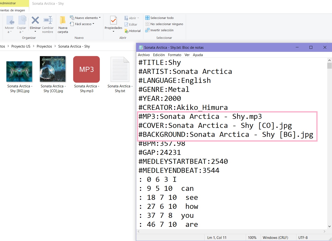 - Siempre tenemos que tener cuidado con la codificación del texto. En el deben ir siempre: Titulo, artista, lenguaje, genero musical, año del lanzamiento de la canción, creador -tu nombre de usuario en UltraStar España-, MP3, Cover y el Video O Background. La edición nunca se pone y se borra del texto, yo ponía el nombre del Album, pero Volodia me dijo que era mejor obviar ese dato; los demas datos se generan junto al text en UltraStar Creator